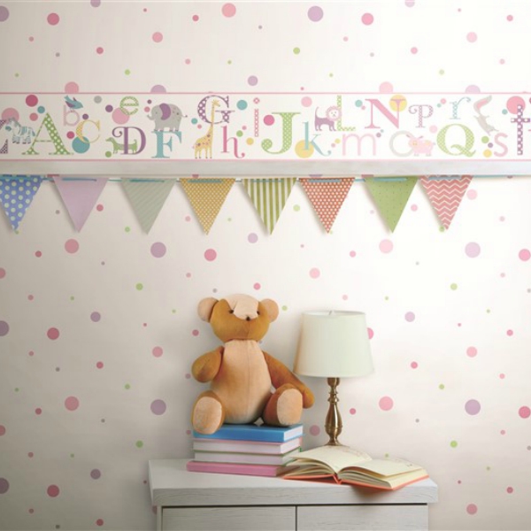 Υπέροχος συνδυασμός παστέλ αποχρώσεων σε αυτό το μοτίβο με την λατινική αλφαβήτα. Μπορντούρα ταπετσαρίας που μπορεί να τοποθετηθεί μόνη της σε βαμμένο τοίχο ή να συνδυαστεί με άλλα σχέδια της συλλογής Growing Up Kids